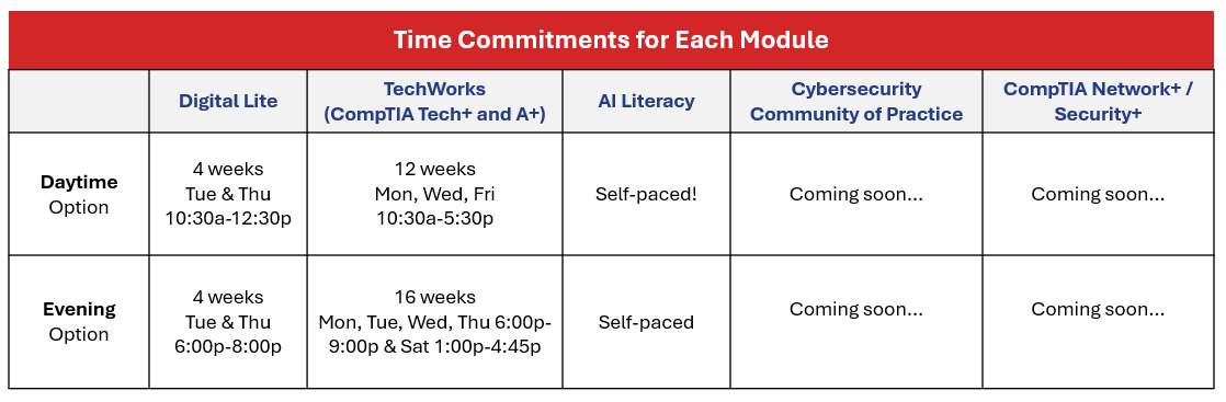 TechWorks » After completing Digital Lite, you will build hardware and software technical support skills, develop modern career-readiness skills, access job search tools, and earn two IT industry credentials: CompTIA Tech+ and A+. (12 to 16 weeks)